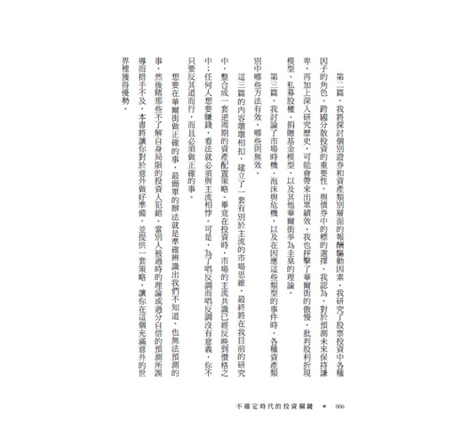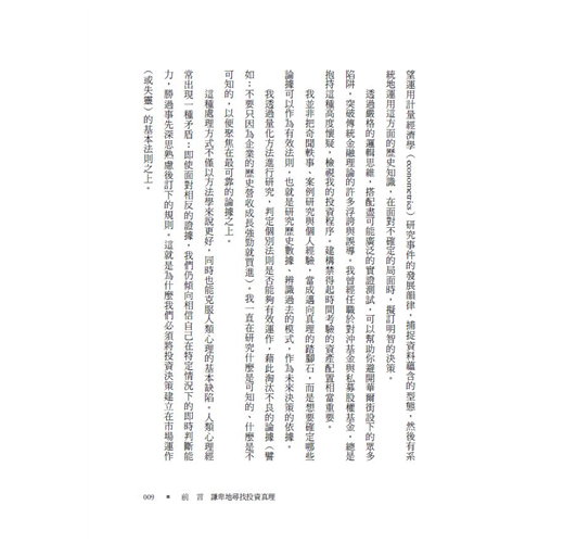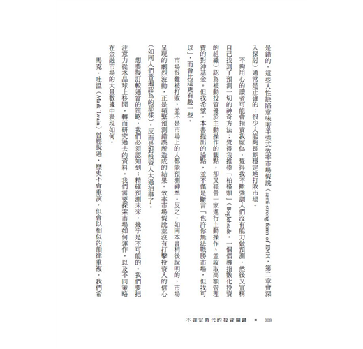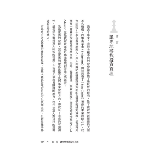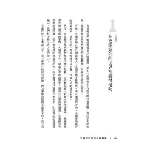 這是一本挑戰傳統金融智慧的顛覆之作!金融市場的本質充滿意外與不可預測,因此我們必須抱持「謙卑」,擺脫試圖預測市場的致命賭局,學會辨識投資的真實運作邏輯,並從他人的過度自信中取得投資優勢。