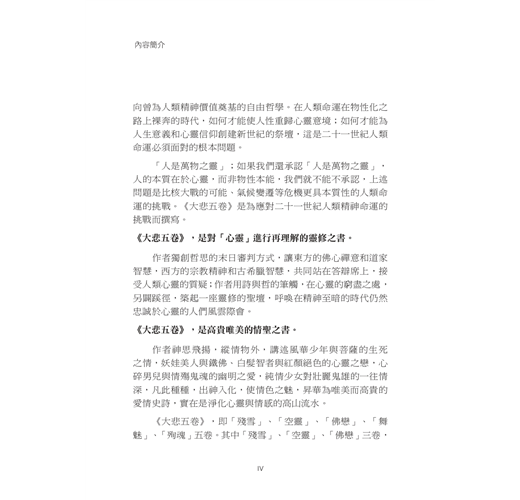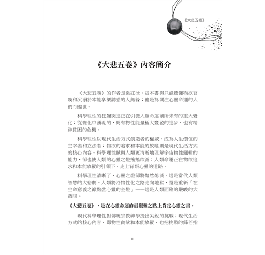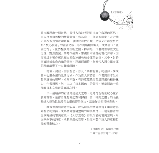 《大悲五卷》,即「殘雪」、「空靈」、「佛戀」、「舞魅」、「殉魂」五卷。其中「殘雪」、「空靈」、「佛戀」三卷,首次展現出一個當代中國哲人和詩者對日本文化命運的沉思:日本是憑藉怎樣的精神能量,作為唯一一個東方國家,在近代史與西方列強並駕齊驅,爭鋒於時代之巔,然後又在經歷核烈焰「焚心裂骨」的苦痛之後,再次從廢墟中崛起,成為當代「亞洲之花」,世界豔羨的文明之國。特別是,作者從古華夏文化之魂「黯然湮滅」的時代視野,審視日本國運的現代昇華,因而使這本著作更具歷史的悲涼韻味和命運的哀傷。其中,對於西鄉隆盛生命內涵的探索,深邃而獨特,為當代人對心靈命運的理解敲響了一次暮鼓晨鐘。