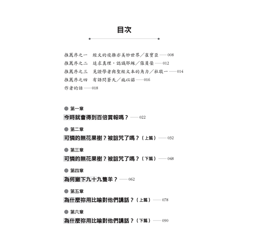 「在福傳的經驗中,我們常遇到教友讀經時心存疑問,例如:耶穌為何常用比喻?為何撇下九十九隻羊去找尋迷失的一隻?(這完全不符合經濟效益)又為何詛咒無花果樹?談良辰弟兄的首部力作中,為這些『福音難題』提出獨到見解與靈修省思,我們可藉此更深入認識主耶穌教導的核心及用心,培養分辨與反省的能力,在現代社會中作真正的門徒,勇敢活出福音的愛。」──鍾安住總主教(天主教台北總教區)