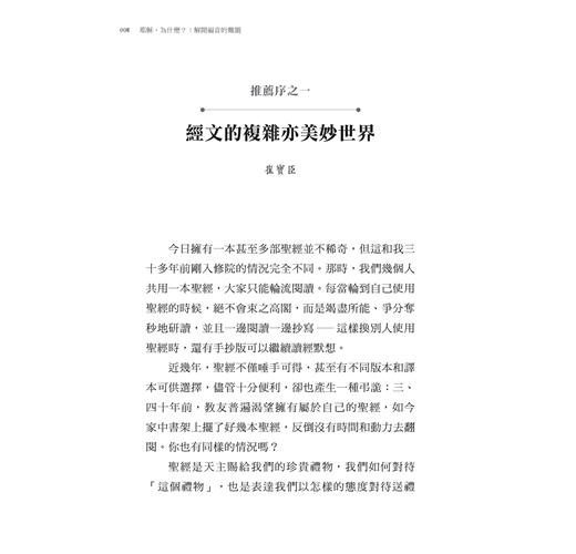 「本書透過細膩的筆觸、多年來積累的讀經心得和聖經原文的適切解析,解開我們心中對某些福音段落的疑難困惑,引導我們發現潛藏於經文細節中的美妙意義。祝福每位讀者在細細品讀之後,將有撥雲見日的感覺,拉近你與聖經的距離!」──崔寶臣神父(輔仁聖博敏神學院校長)