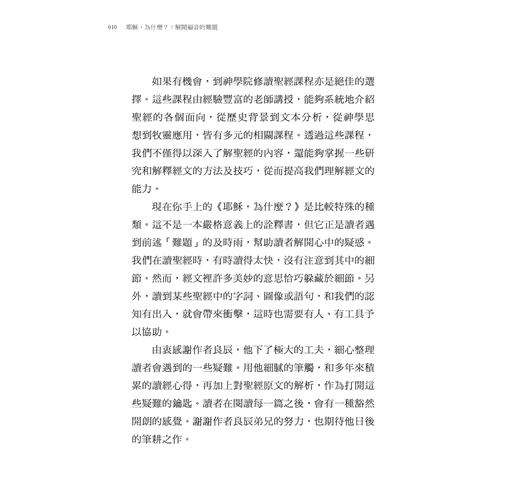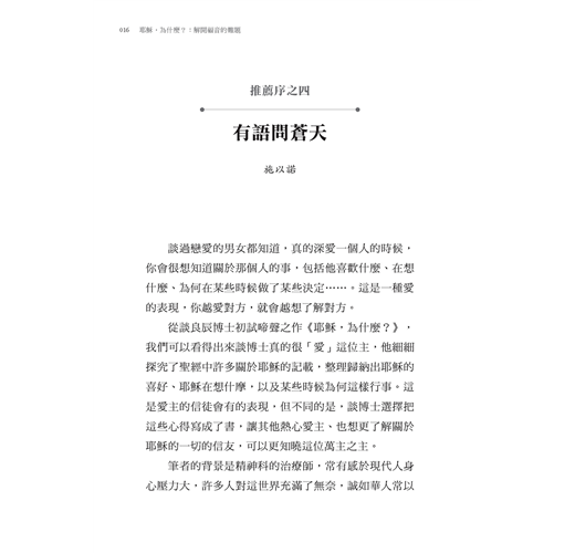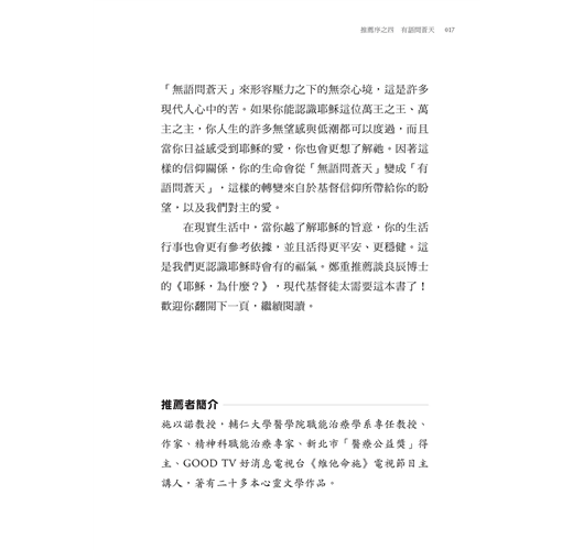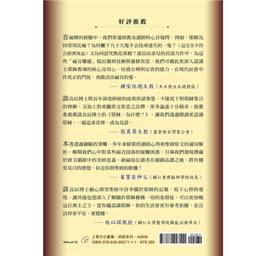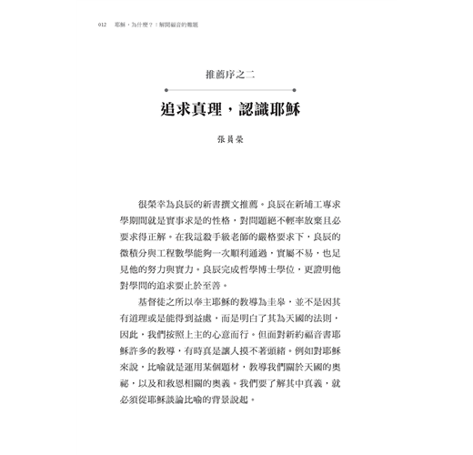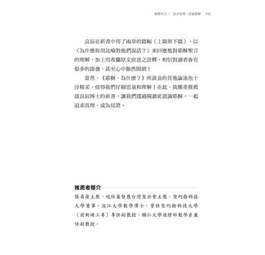 「談良辰博士將長年深度研經的成果形諸筆墨,不僅寫下對耶穌聖言的理解,又加上對希臘原文原意之詮釋,眾多論述十分精采。我鄭重推薦談良辰博士的《耶穌,為什麼?》,讓我們透過閱讀更認識耶穌,一起追求真理,成為見證。」──張員榮主教(基督教台灣聖公會)