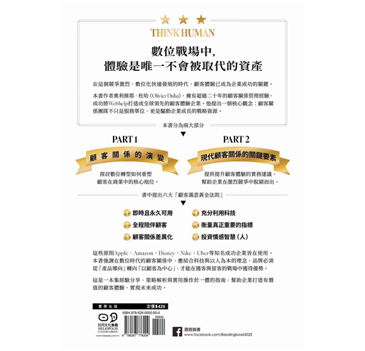 這些原則Apple、Amazon、Disney、Nike、Uber等知名成功企業皆在使用。本書強調在數位時代的顧客關係中,應結合科技與以人為本的理念,品牌必須從「產品導向」轉向「以顧客為中心」,才能在獲客與留客的戰場中獲得優勢。