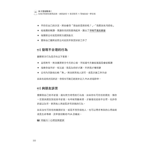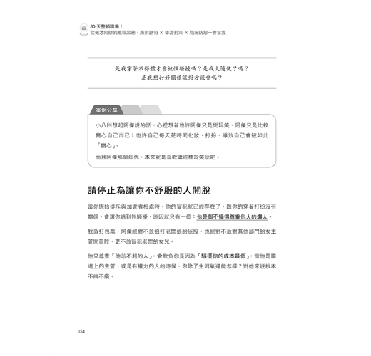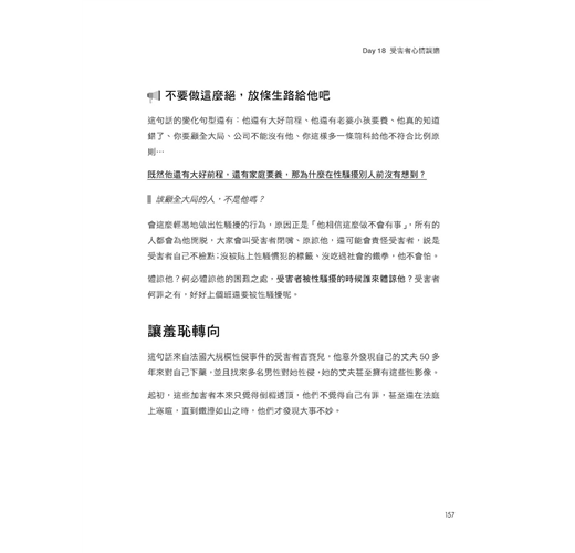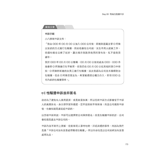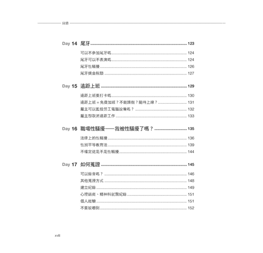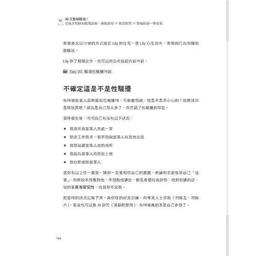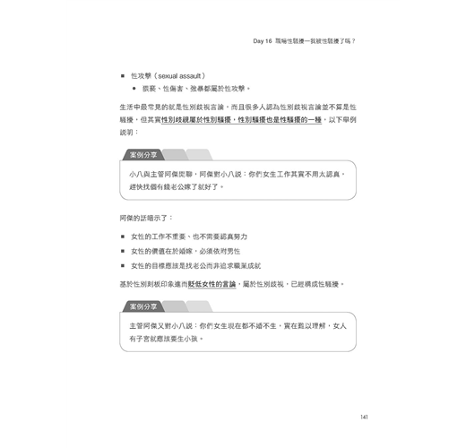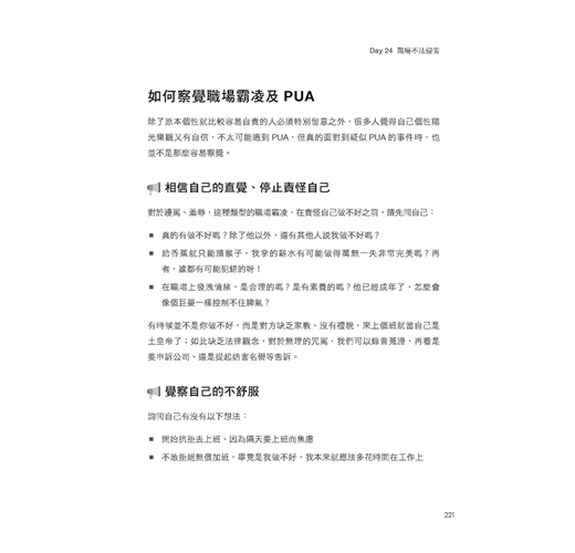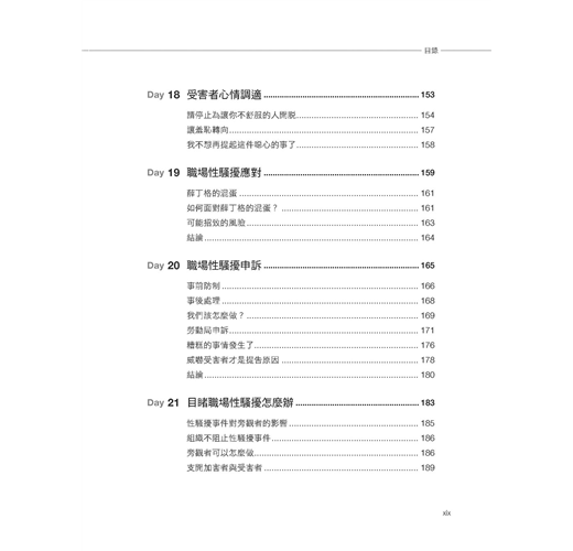 本書 Day 16 - Day 22 為職場性騷擾相關篇章,從如何察覺性騷擾、申訴公司到如何調適被性騷擾的心情,都一一為你解惑,如果曾遭遇不同形式的職場性騷擾,我想這本書會給你很大的力量。
