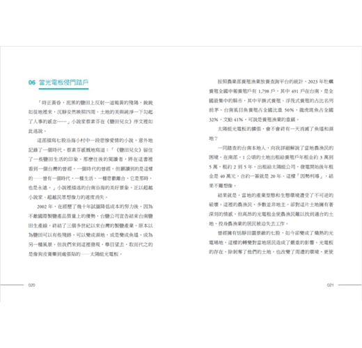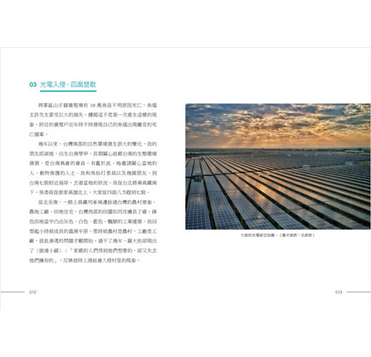 本書反思綠能與生態的輕重權衡,梳理光電弊案的來龍去脈,以及一窩蜂的全台種電風潮。作者本著政治工作者的初心,積極提出「我們要的是零碳家園,而不是非核家園」之願景,批判政府不該因意識形態,提出躁進不務實的政策;更不該為了經濟,犧牲環境,深入叩問台灣這塊土地的未來究竟要往哪裡走。