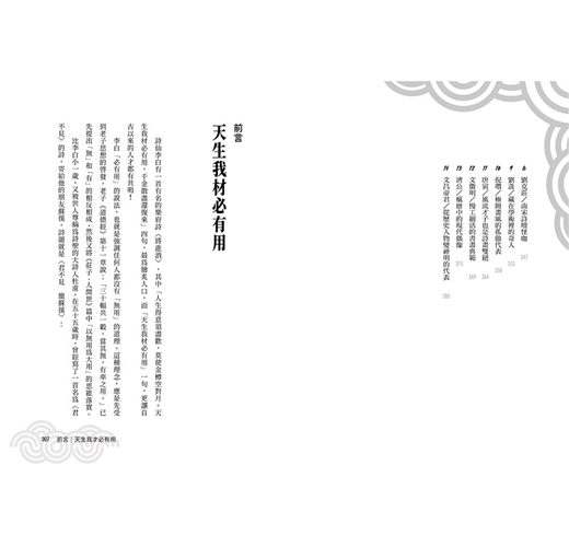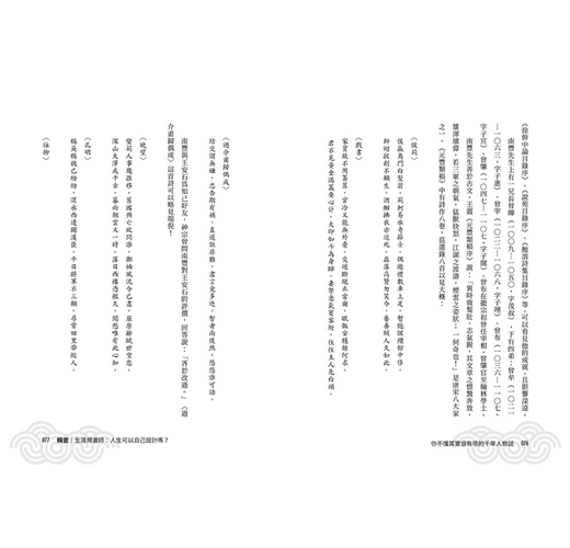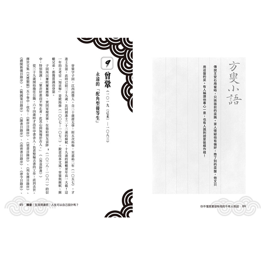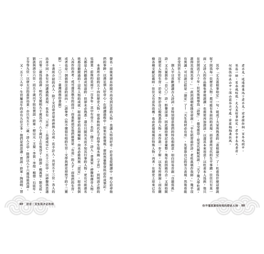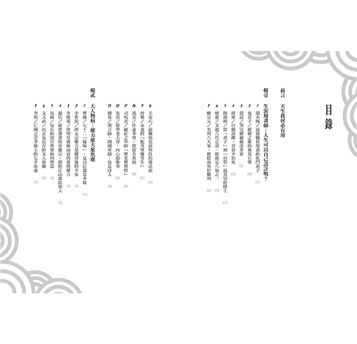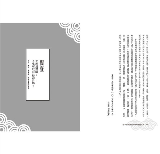 承蒙臺灣商務印書館編輯團隊的費心,將五十四位人物,從原來按時代先後排列的形式,轉為就人的才能表現重新整理而分成四輯,每輯各有提示,如輯壹為「生涯規畫師⼀⼀人生可以自己設計嗎?」然後又將該輯所收人物的才能表現列為:「哲人、策士、改革者、關鍵抉擇型人物」,再就所收人物各別用一句話作概括,如:「蘇軾:人生百味的最佳代言人」。如此整編,確實可以使讀者在閱讀前已先掌握方向,閱讀時更能領略會心了!