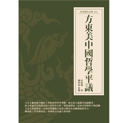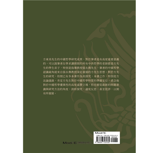 本書之作,針對方東美先生對中國哲學詮釋意見的反思而展開。圍繞方先生兩大理論建構的重點,予以討論:其一,以形上學為中心的研究方法;其二,對儒釋道三家理論的詮釋。首先,方先生以形上學為第一哲學,以中國哲學有形上學,並且有極具特色之形上學而探討中國哲學。其次,方先生對儒釋道三家的詮釋觀點呈現出以體系化重構傳統的努力,既成就了其學術特色,亦暴露方法論上的局限。本書關於方東美哲學創作的研究,通過反思其對中國哲學的詮釋意見,以期對當代中國哲學研究的方法論建構有所貢獻。