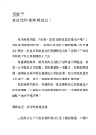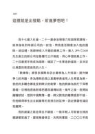 如他所言:「不少年輕人常有抱怨,感嘆『我沒辦法……』、『我不得不……』,習慣把決定權交付他人手中,萬一結果不如預期,再回頭自怨自艾,旁人過多同情反讓他們更耽溺於受害者的角色。」他接者說:「不如盡早覺醒,改變思考和說話習慣,從『I can not』改為『I can』,再進化為『I will』。心念改變讓力量大幅躍進,必能贏回人生的主導權。」