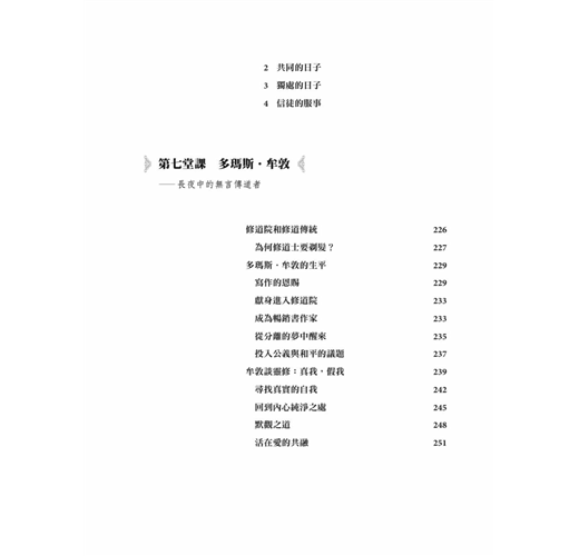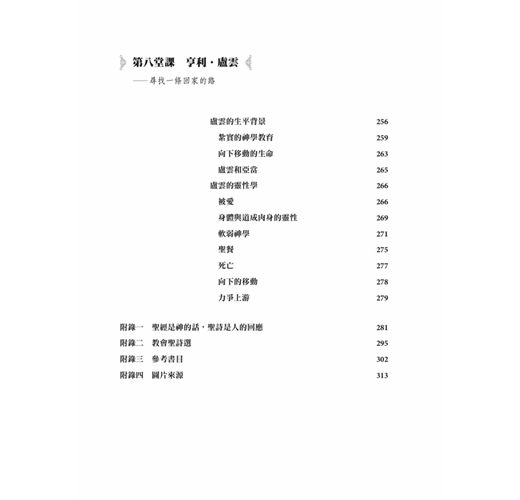 本書的篇章,並非單純為八位靈修大師書寫傳記,因此它們不只是敘事性的,更是闡釋性的。為了使尋求屬靈深度的人能夠有所理解,每章皆呈現靈修大師的生命故事,突顯其核心教導,勾勒其歷史影響,並探討其教導如何塑造今日信徒的生命。本書目的並非將他們奉為不可觸碰的偶像,而是人生旅途中的同伴和導師。