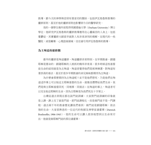 這個系列的課程內容,選擇過去兩千年來教會重要的靈修學者,尤其後面幾堂是大家比較熟悉的近代靈修大師對靈修的貢獻。過去兩千年教會重要的靈修學者所留下的作品,讓我們不得不好好地閱讀。我在神學院常常鼓勵學生要多讀書,一個傳道人應該是一個書蟲,但台灣的教會文化比較是活動型的,多於讓牧者可以安靜下來,在神面前等候祂,同時準備他所要宣揚的道。
