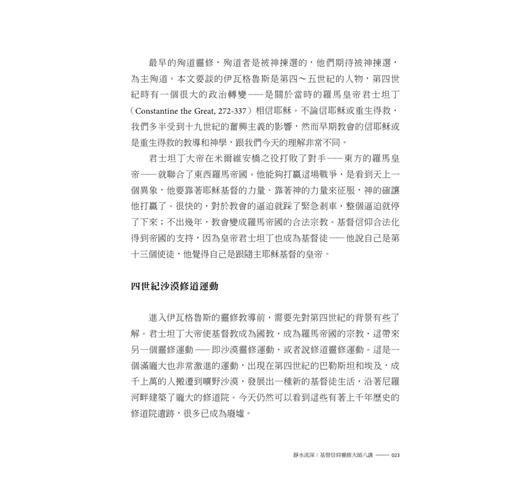 特別是在步調快速的後現代生活中,我們需要學習古代聖徒們的智慧,不只是在知識層面的認識,更要在生命中效法他們;從如何面對試探與軟弱,到如何活出愛與合一;從如何操練禱告與安靜,到如何在失落中仍然盼望神的同在。這就是靜水流深的奧祕——在表面的日光之下,蘊藏著改變世界的力量。