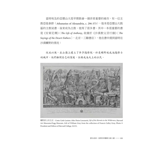 當時埃及的亞歷山大是早期教會一個非常重要的城市,有一位主教亞他拿修(Athanasius of Alexandria, c. 296-373),他本是亞歷山大教區的主教祕書,後來成為主教,他寫了很多書,其中一本很重要的書是《安東尼傳》(The Life of Anthony, 收錄於《沙漠教父言行錄》〔The Sayings of the Desert Fathers〕,北京:三聯書店),他在書中提到當時在沙漠曠野的情況: