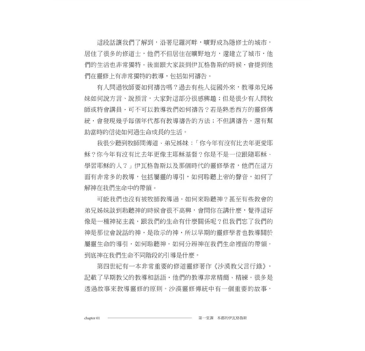沙漠退隱者伊瓦格魯斯的靈修只有神祕感和苦修嗎?作者的看法是否定的。神學與禱告的關係同樣是伊瓦格魯斯的關注,但他的形態是在無言無語、靜默、安息和仰望中接觸神。隱修者亦早已注意到心靈健康,如何培養不動心無偏情的生命特質,並透過神的形塑,轉化負面情緒成為德行。