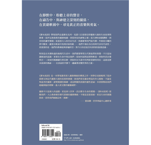 《靜水流深》帶領我們走進歷史長河,見證八位基督信仰靈修大師的生命故事與教導:從伊瓦格魯斯的靈修地圖,到茱利安的神聖之愛;從方濟的貧窮讚歌,到肯培的謙卑實踐;從蓋恩夫人的內在生活,到潘霍華的門徒代價;牟敦從分離的夢中醒來,盧雲在軟弱中找到回家的路――他們不僅在各自的時代具有代表性,更重要的是,他們的教導能夠穿越時空,對今日的信徒仍有深刻的啟發意義。