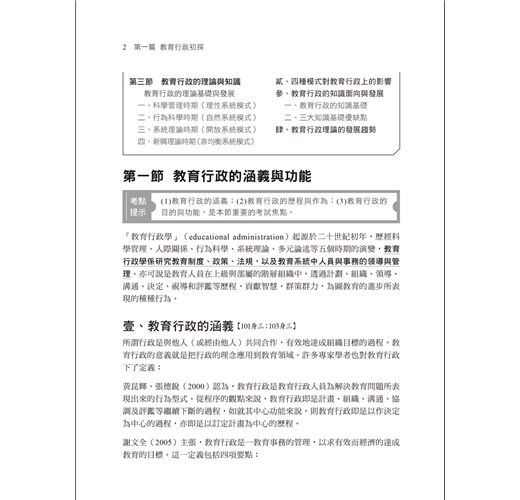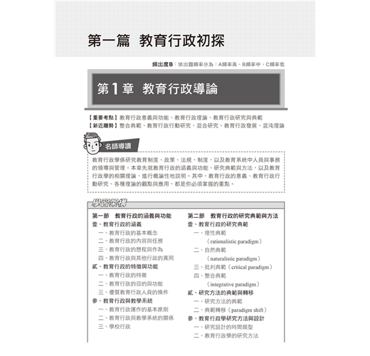 「教育行政學」,考試的難度有愈來愈深的趨勢,為了簡化你閱讀理解的時間,加深了解各章的架構,在每一章節前列出該章「出題頻率」、「重要考點」與「新近趨勢」,有綱舉目張之效。並輔以「名師導讀」、「學習架構」、「考點提示」,熟悉各章考題類型與方向,搭配「考題集錦」,答題通古貫今,熟能生巧。