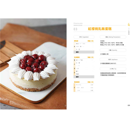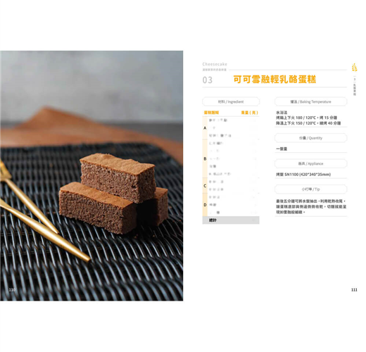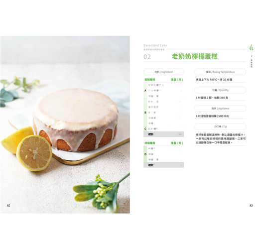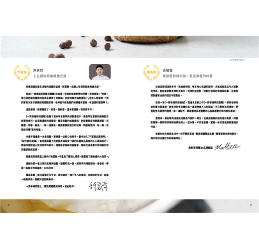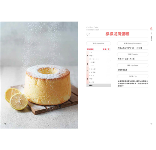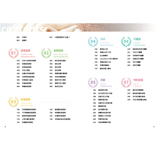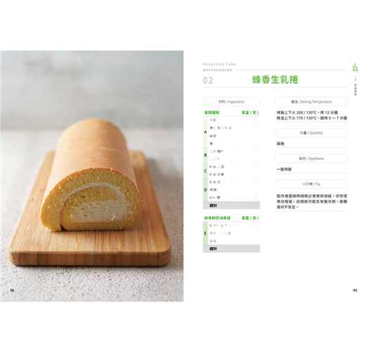 「幸福」,許家齊老師深信,烘焙不只是技術的展現,更是情感的傳遞與生活美學的體現。書中分為六大章節:戚風蛋糕、裝飾蛋糕、乳酪蛋糕、派塔、司康以及可麗露,每一類都從經典基礎出發,延伸至創新變化。從經典配方到融合東方韻味的口味,展現了作者對於風味層次的深刻理解。