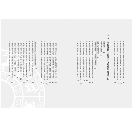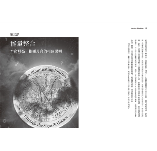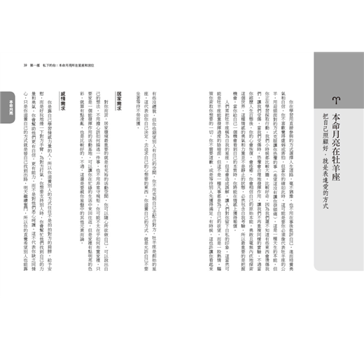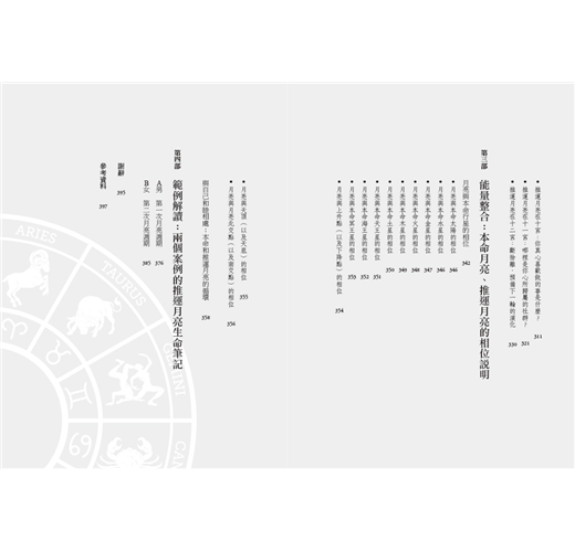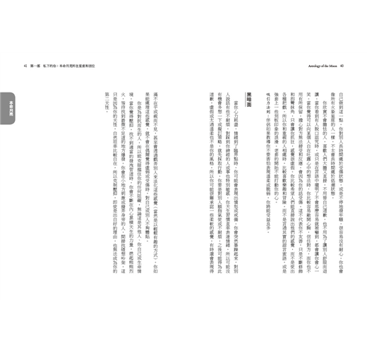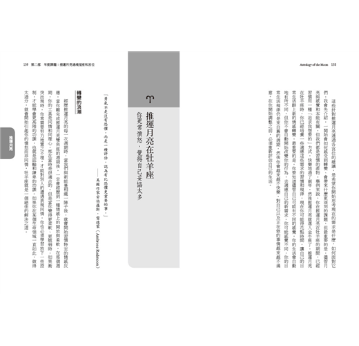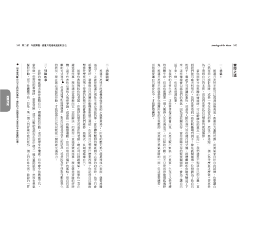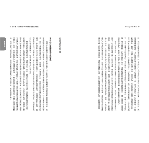 通俗占星學喜歡用描述性的字眼,像是形容牡羊座「大膽」、「果決」和「霸道」,或是形容處女座「井然有序」、「務實」和「挑剔」。如果你認識一團亂的處女座或客氣有禮的牡羊座,請舉手! 善用占星學的最佳方式並不是分門別類,而是提出指引和應對之道。我們如果不要以「自己目前狀態」為出發點,而是用「正要變成的模樣」看待自己的星盤,就能開啟對星盤的全面理解。星盤就像我們的處方籤,建議我們如何活出更充實的人生。你的本命星盤是你最重要的工具,當你知道如何正確利用它時,它就能在你身上發揮更好的效果。這本書會教導你如何使用這個工具中的一個重要元素:月亮。我不只會列出每個月亮星座的性格特質,還會提供你一個範疇,告訴你會在哪個範圍的經驗和課題中遊走,體驗生命,而這都取決於你的選擇。因此,你可以把你的星盤想像成一張地圖,當你在吸收個人經驗時,當你在琢磨理解人生的方向時,月亮就像指南針,指引你航渡大海,時而風平浪靜,時而波濤洶湧,穿越不同的國度,無論熟悉或陌生都能跨步向前。
