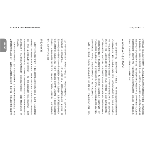 我們不要太過天真。不是所有人都能在夢想的工作中找到自己,這特別無法馬上如願。很多人的工作都只是能領份薪水。這是我們想要的工作,也是我們容易勝任的工作,因為我們擁有被雇用的技能,也必須有錢過日子。不過人生充滿了機會,我們可以稍微向前推進,修正道路,例如白天上班,晚上上夜校,或是參加在職訓練,留意有沒有升職機會。無論我們剛好高中畢業,或是之後發現自己正站在人生的十字路口,當我們能自由考慮人生的道路,不要在一開始就輕忽任何想法,那麼此時從腦海中跳出的問題,通常都不是「我能馬上得到什麼?」而是「我想要什麼?」而這就是月亮的問題。