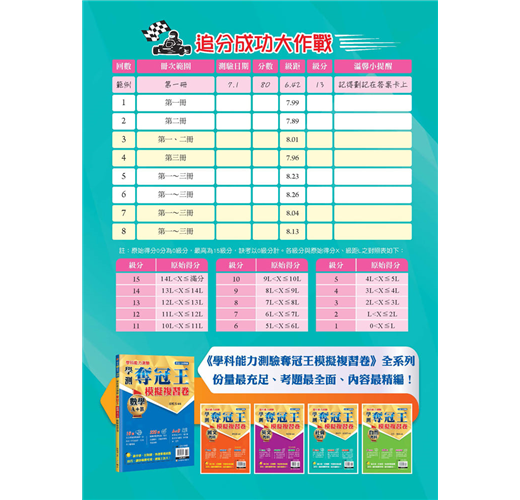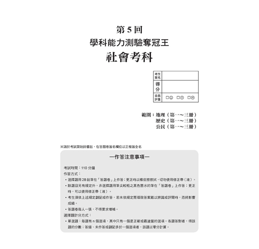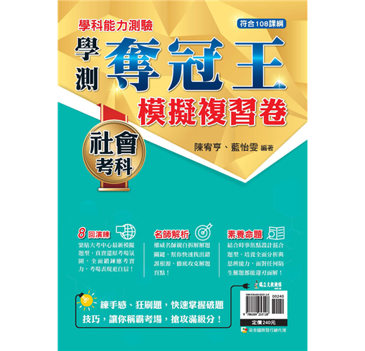 學測試題向來靈活多變,與其害怕考題的千變萬化,不如從現在開始立定決心培養實力,深入複習常考重點,才能掌握答題要領,增加上考場的信心,在這場激烈的戰爭中贏得勝利的一仗。奪冠王系列模擬複習卷,期望能成為您最佳的學習夥伴。只要相信自己,沒有做不到的事情!