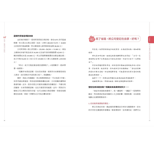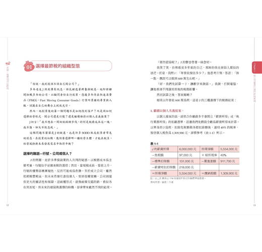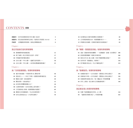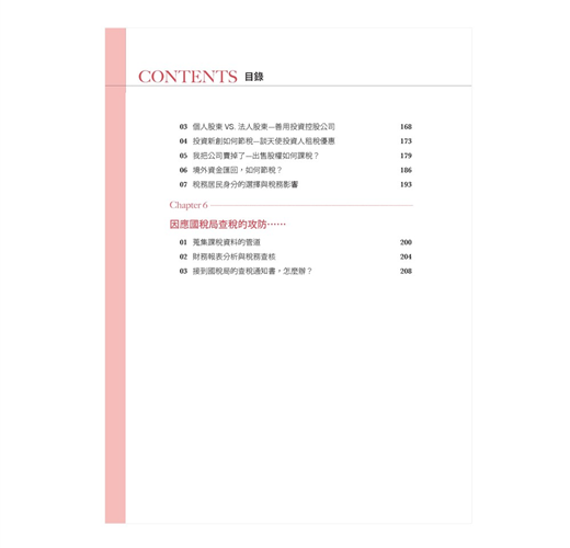 全書共分六大章節,從第一章為公司量身打造的節稅策略,來到與「日常營運開銷」、「購置、管理固定資產」有關的節稅策略,乃至於如何應對「股權投資」的相關節稅策略,甚至是與老闆個人息息相關的節稅策略,直到最後一章探討如何因應國稅局查稅的攻防……