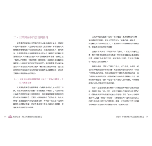 本書同時以大英博物館作為田野調查的第一現場,透過《晚清百態》、《特洛伊:傳說與事實》等特展的具體案例呈現,訪談、剖析與反思該館策展人在當代展覽策略中的實踐方式。
