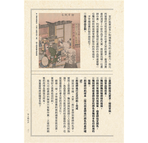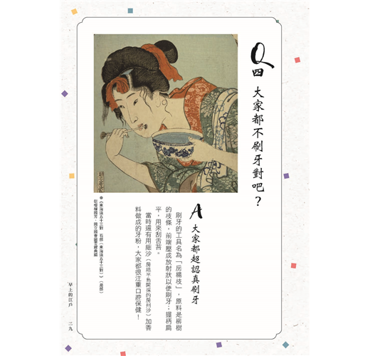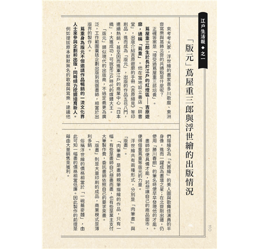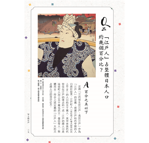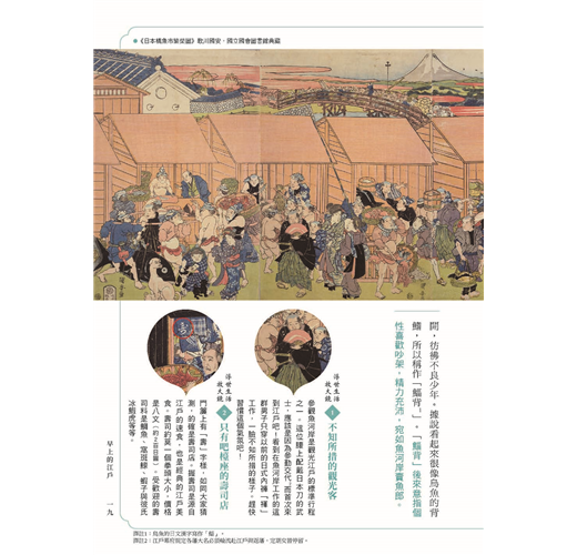 「江戶生活報」呈現當時的時尚潮流、出版盛況、戀愛指南;「浮世生活放大鏡」聚焦畫中細節;Q&A單元回答江戶生活大小疑問——閱讀宛如翻閱一份江戶時代報刊,趣味橫生。