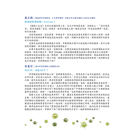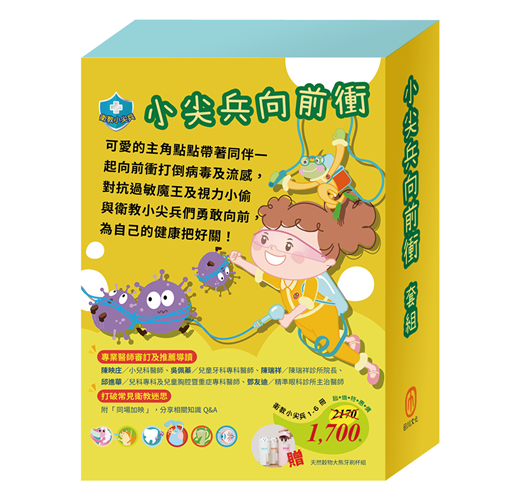 從可愛角色和奇幻劇情到深入淺出的醫學衛教知識,【衛教小尖兵】系列是家長陪伴孩子一起學習預防醫學的好幫手。書中角色們無論生病與否,都勇敢面對問題,能成為孩子進步的榜樣;我們也希望孩子開心閱讀繪本之餘,慢慢養成自主管理的能力。願每個孩子都可以身強體壯而且快樂開朗,長大後可以傳遞正衛教觀念的,讓我們與孩子一起翻開書籍,學會如何保護自己的健康吧!