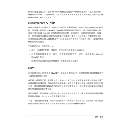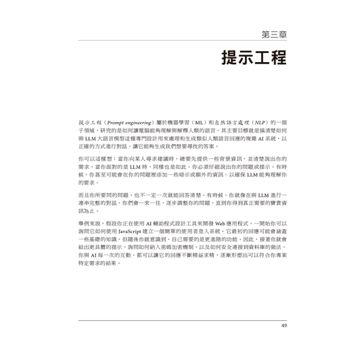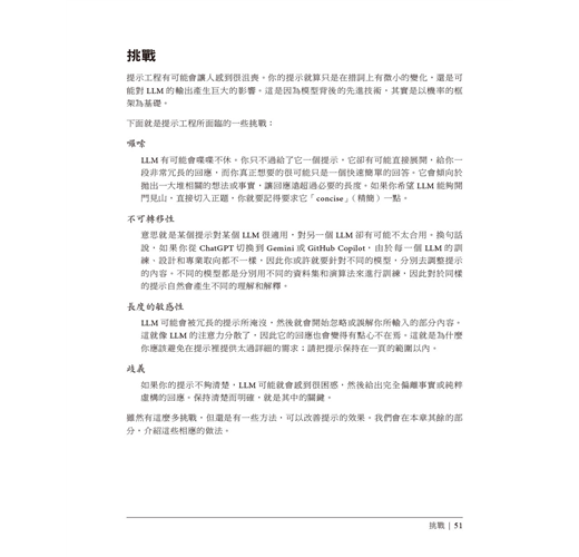 作者Tom Taulli提供了一套完整的模組化程式設計方法論,這套方法論與大家利用提示來生成AI程式碼的做法非常契合。這本指南還介紹了如何以通用的LLM來學習程式語言、解釋程式碼,或是把程式碼從某一種語言轉換成另一種語言的最佳做法。