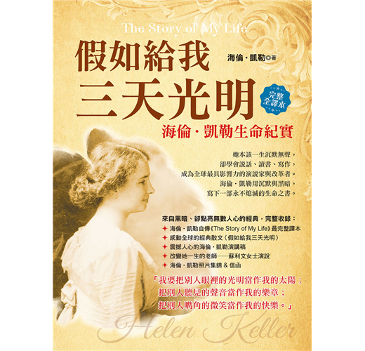 海倫‧凱勒(1880–1968)為著名作家、教育家、社會運動家。自幼失明失聰,卻憑藉堅毅的意志與恩師安妮‧蘇利文的陪伴,學會語言並完成學業,成為史上第一位取得大學學位的聾盲人。她畢生致力倡導殘障者權益與社會改革,以其真摯感人的文字與演講,鼓舞全球無數心靈。著有14本書和超過475篇的演講與文章,包括《我的人生故事》、《黑暗中的光明》、《假如給我三天光明》等作品。
