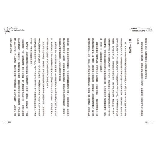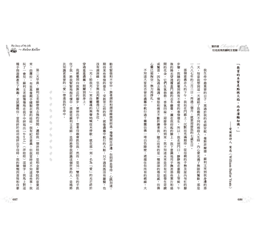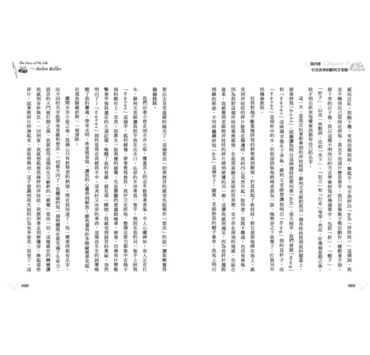 讀經典最怕什麼?不是年代久遠,而是翻譯太惱人、妨礙你入戲。本書以完整內容與流暢翻譯完勝坊間,不刪減、不取巧,忠實傳達海倫‧凱勒的聲音。她的喜悅與痛苦、她的迷惘與勇氣,都在文字裡清晰躍現。讀者能夠細讀她從童年時代的純真,到落入黑暗後的焦躁,以及如何在愛與知識的陪伴下走向世界。這是一次真正貼近她聲音的閱讀體驗,而非二手轉述的勵志故事。