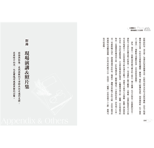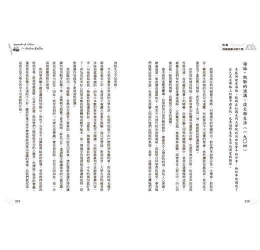 除了海倫‧凱勒的親筆自傳之外,特別收錄她的經典散文〈假如給我三天光明〉,以及多篇公開的演講,從無法發聲的聾盲人,到能在大眾面前開口表達思想的社會改革者,透過演說,更能感受海倫‧凱勒的滿腔熱血,以及與同窗對話的溫暖和幽默。同時也收錄安妮‧蘇利文的教育演說,讓讀者得以從師生雙視角感受「奇蹟的誕生」。書末更附上海倫‧凱勒的成長照片與相關信函紀錄,展現她在不同場合的真實身影。還原她真實而立體的「人生全紀錄」。