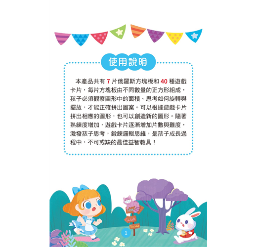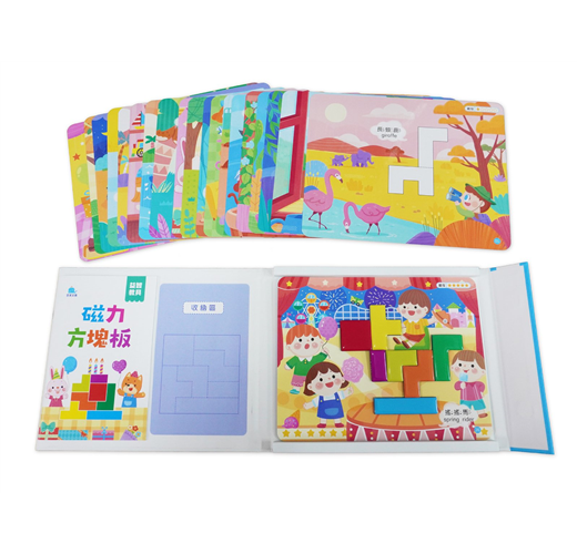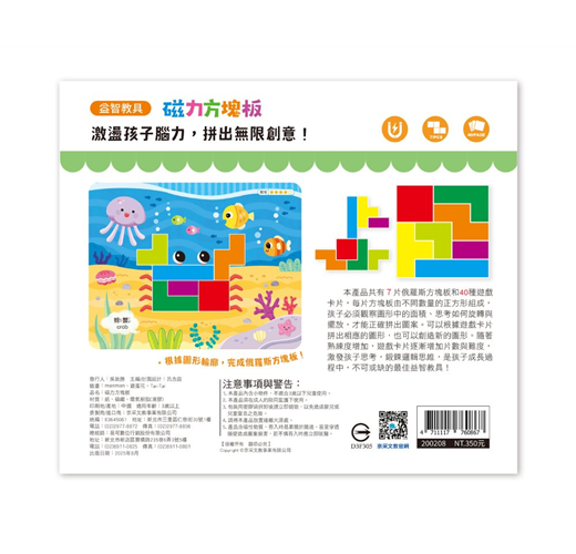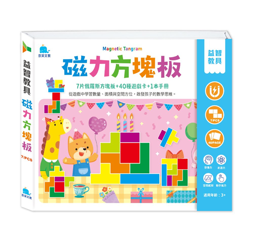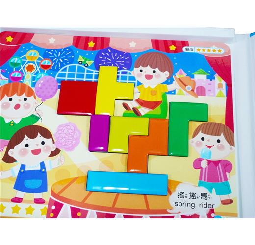 本產品共有7片俄羅斯方塊板和40種遊戲卡片,利用磁力拼貼的方式固定圖形,讓孩子好動手、易操作、得到成就感。每片方塊板由不同數量的正方形組成,孩子必須觀察圖形中的面積、思考如何旋轉與擺放,才能正確拼出圖案。