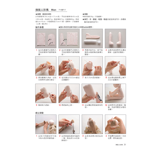 主體除了以一般的接縫方式製作之外,部分作品也在手腳中包捲入鐵絲或鋁線,讓人形偶的姿勢可以更加豐富。若將人形偶的手部作得更加細緻,在五根手指的充棉中一一捲入鋁線,還能讓人形偶作出如持花、編織等生動的姿態喔!