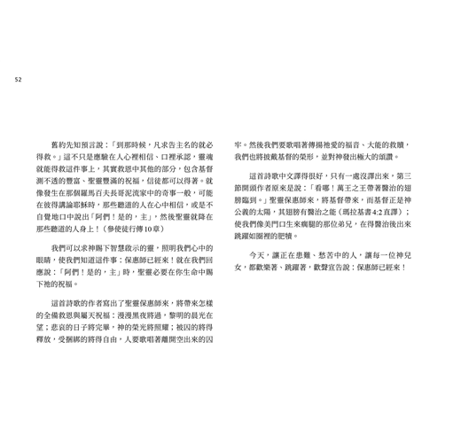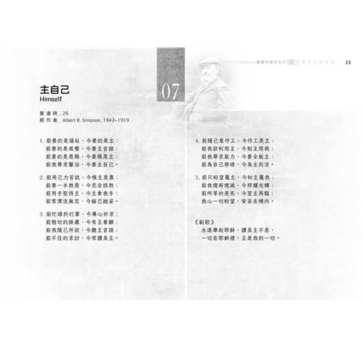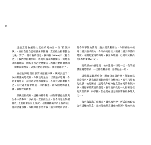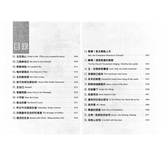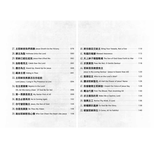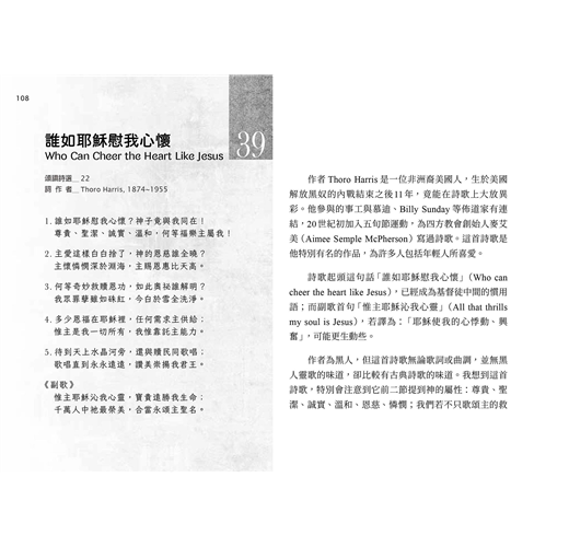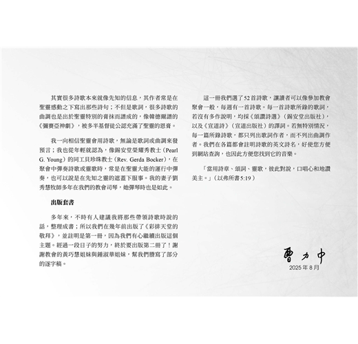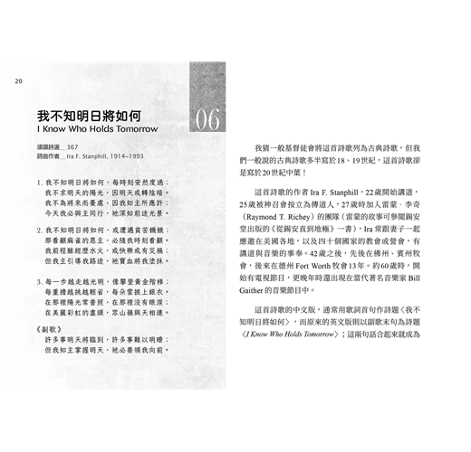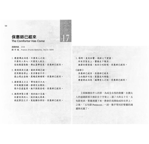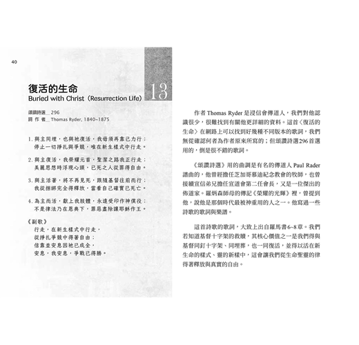 這一冊我們選了52首詩歌,讓讀者可以像參加教會聚會一般,每週有一首詩歌。每一首詩歌所錄的歌詞,若沒有多作說明,均採《頌讚詩選》(錫安堂出版社),以及《宣道詩》(宣道出版社)的譯詞。若無特別情況,每一篇所錄詩歌,都只列出歌詞作者,而不列出曲調作者。我們在各篇都會註明詩歌的英文詩名,好使您方便到網站查詢,也因此方便您找到它的音樂。