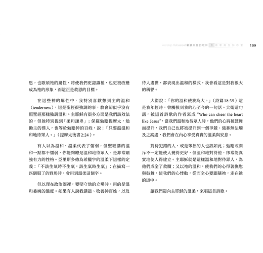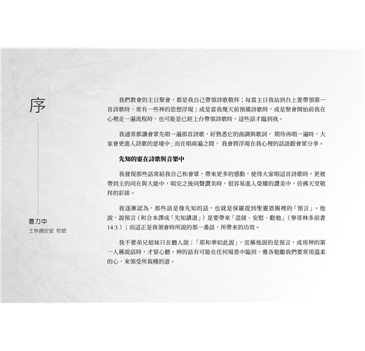 多年來,不時有人建議我將那些帶領詩歌時說的話,整理成書;所以我們在幾年前出版了《彩排天堂的敬拜》,並註明是第一冊,因為我們有心繼續出版這個主題。經過一段日子的努力,終於要出版第二冊了!謝謝教會的黃巧慧姐妹與鍾淑華姐妹,幫我們謄寫了部分的逐字稿。