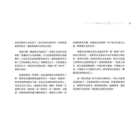 我想這首詩歌也是在表達這件事。第一節說「我不知明日將如何」,我們的安全感並不來自知道明日將如何,我們在等候、期待的事尚未來到時,就可以知道主掌管明天也握著我的手,我會與祂相偕、一起進入明天。所以詩歌提醒我們,不要為明天憂慮,不要擔心未來,只要留心今天要與主同行;將望著明天的眼目,轉移到此刻神的同在上。