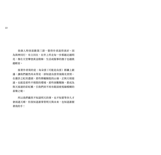 接著作者寫的是:每朵雲(可能是烏雲)都鑲上銀邊,讓我們雖然尚未得見,卻知道烏雲背後陽光普照。在應許之虹的盡頭,那些障礙險阻的山嶺,正與天相接連。也就是那些不理想的環境,那些困難艱險,都成為與天接連的彩虹橋,引我們到不再有眼淚使視線模糊的喜樂之境。