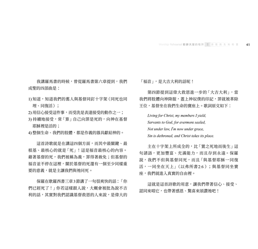 我發現那些話常給我自己和會眾,帶來更多的感動,使得大家唱這首詩歌時,更被帶到主的同在與大能中,唱完之後同...