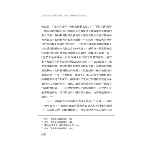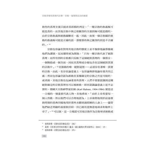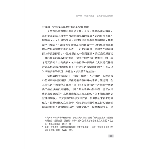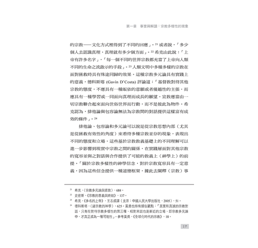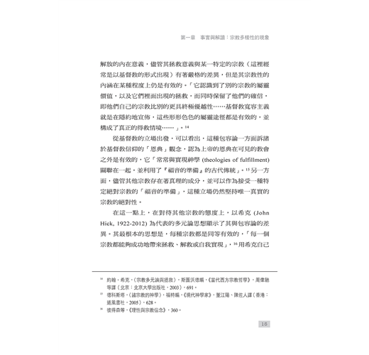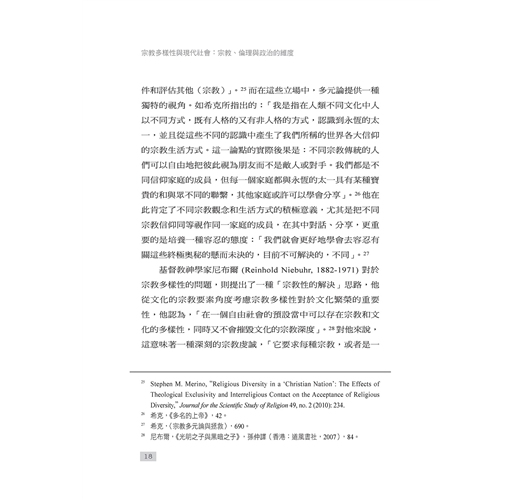 本書倡導一種社會向度的宗教對話,並以此形成理解宗教多樣性兩種方式:一方面,宗教思想內部有著對差異中合一的渴求,為人類生活尋求共同的倫理價值;另一方面,從宗教多樣性的事實,到對其加以積極回應的多元主義,驅使著宗教寬容以及宗教自由,推動著一般意義上的良知自由。與之同時,自由主義的基本價值對於多元性的充分認可,也成為宗教多元繁榮的重要保證。
