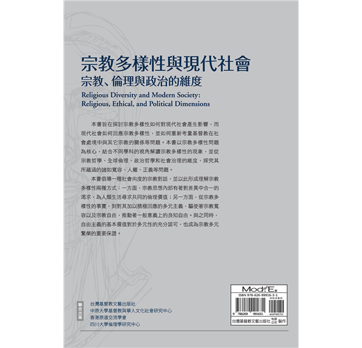 本書旨在探討宗教多樣性如何對現代社會產生影響,而現代社會如何回應宗教多樣性,並如何重新考量基督教在社會處境中與其它宗教的關係等問題。本書以宗教多樣性問題為核心,結合不同學科的視角解讀宗教多樣性的現象,並從宗教哲學、全球倫理、政治哲學和社會治理的維度,探究其所蘊涵的諸如寬容、人權、正義等問題。