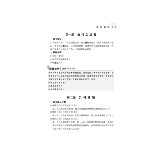 筆者特別將新公司法具有考相的重點按公司法各大章節加以編排,藉此讓考生建立一個完整的體系,只要念一本書就可以成功克服新公司法的所有難題。