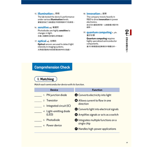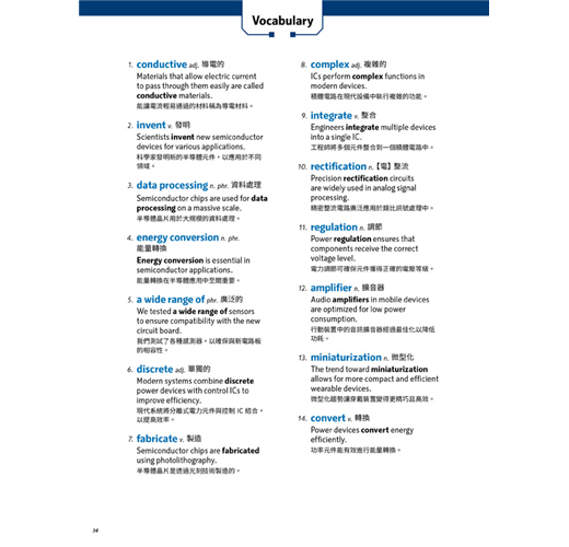 • 關鍵詞彙:精選專業字彙並附例句,強化必備語言能力。