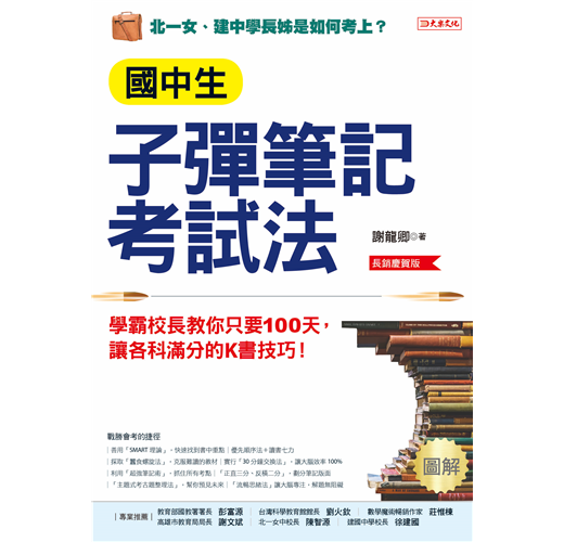 欣見龍卿校長在公忙之餘,仍心心念念學子的學習成效,本書中從讀書方法、筆記訣竅,到會考的準備技巧,既詳細有料又極具參考價值,值得各位老師選為學習策略用書,或是青少年寒暑假增廣閱讀視野的參考書目,也適合所有家長用來學習引導孩子讀書輕鬆有效的方法,增進親子關係。