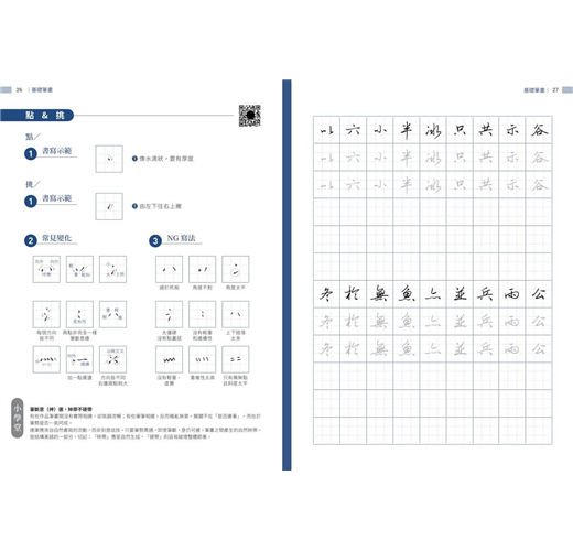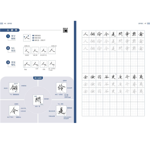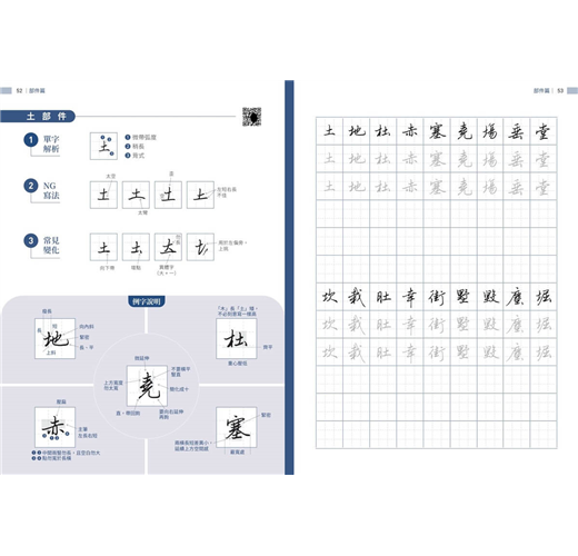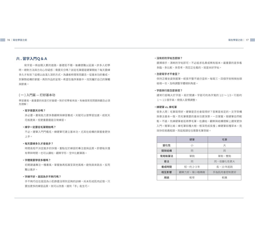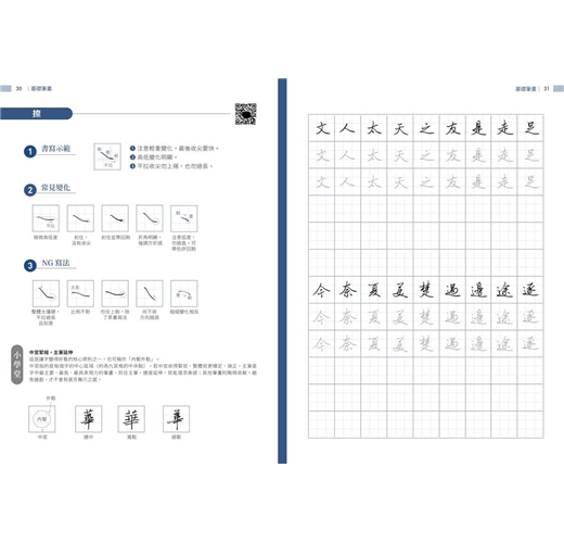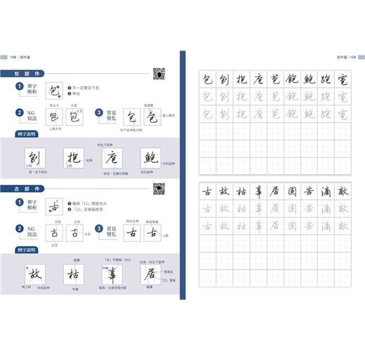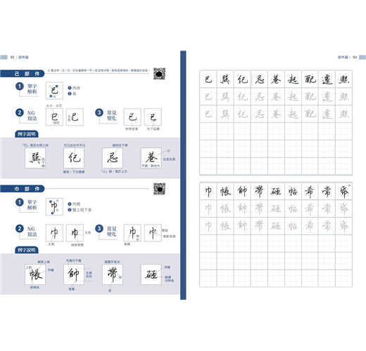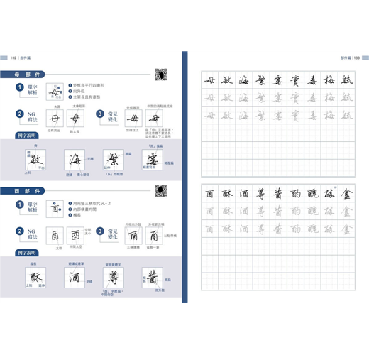 書中精選超過千字常用字,除了示範標準筆畫與部件結構,還特別整理出常見的NG寫法與變化技巧,幫助學習者及時糾正錯誤動作。每個字的解析都清楚呈現正確與易錯的差異,使練習更有針對性。無論是橫、豎、撇、捺,還是轉折、鉤法,都能逐步掌握細節,從基礎到進階,循序漸進提升字型穩健度與整體美感。
