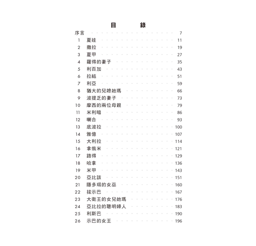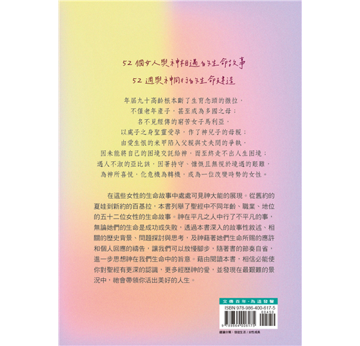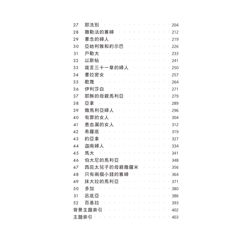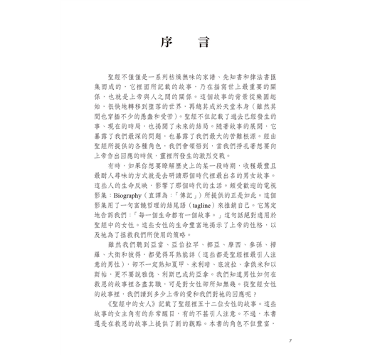 《聖經中的女人》記載了聖經裡五十二位女性的故事。這些故事的女主角有的非常醒目,有的不甚引人注意。不過,本書還是在救恩的故事上提供了新的觀點。