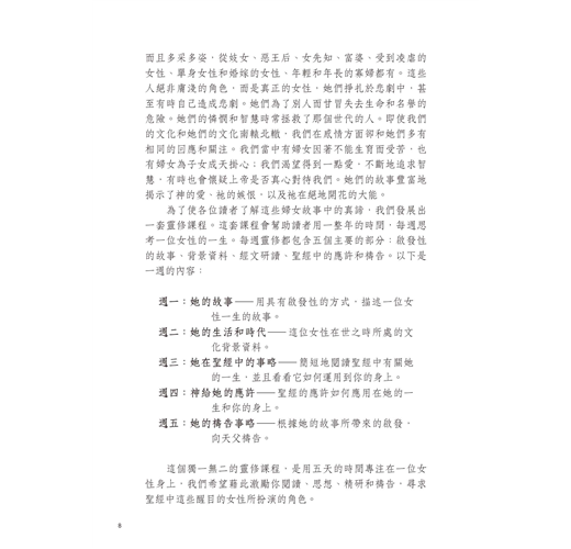 為了使各位讀者了解這些婦女故事中的真諦,我們發展出一套靈修課程。這套課程會幫助讀者用一整年的時間,每週思考一位女性的一生。每週靈修都包含五個主要的部分:啟發性的故事、背景資料、經文研讀、聖經中的應許和禱告。這個獨一無二的靈修課程,是用五天的時間專注在一位女性身上,我們希望藉此激勵你閱讀、思想、精研和禱告,尋求聖經中這些醒目的女性所扮演的角色。
