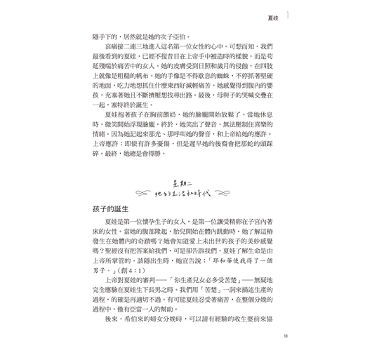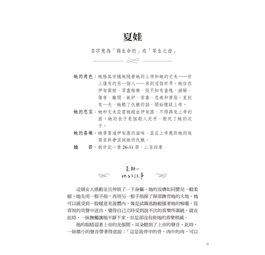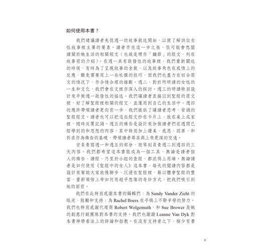 2. 無論讀者是如何使用《聖經中的女人》這本書,每天的閱讀內容都是設計來幫助大家放慢腳步、沉浸在聖經裡,藉以體會聖經的豐富,重新領悟上帝如何用超乎想像的奇妙方式,把我們吸引到祂的面前。