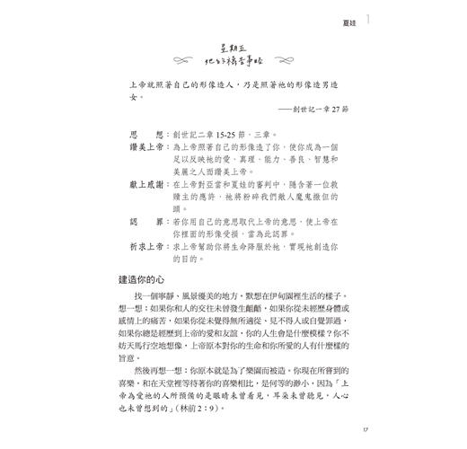 週三的研讀特別設計來平衡週一啟發性的描述。我們讓讀者直接回到聖經的原文裡,好了解聖經裡相關的經文,並運用到自己的生活中。