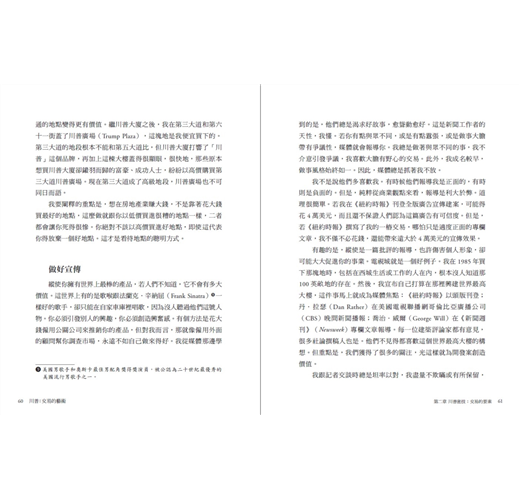 川普大廈尚未落成之前評論家並不看好,但落成之後獲得大眾一致好評。我說的大眾不是那些在一百七十五年前繼承祖先遺產、生活在第八十四街和公園大道上的人,我說的是有漂亮老婆和紅色法拉利跑車的義大利富商,那些人是我追求的客群,他們成群結隊來到川普大廈。