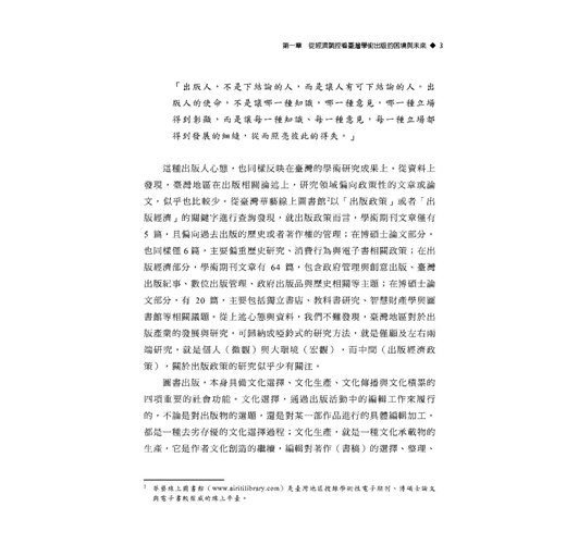 這種出版人心態,也同樣反映在臺灣的學術研究成果上。從資料上發現,臺灣地區在出版相關論述上,研究領域偏向政策性的文章或論文,似乎也比較少。從臺灣華藝線上圖書館以「出版政策」或者「出版經濟」的關鍵字進行查詢發現,就出版政策而言,學術期刊文章僅有5篇,且偏向過去出版的歷史或者著作權的管理;在博碩士論文部分,也同樣僅6篇,主要偏重歷史研究、消費行為與電子書相關政策;在出版經濟部分,學術期刊文章有64篇,包含政府管理與創意出版、臺灣出版紀事、數位出版管理、政府出版品與歷史相關等主題;在博碩士論文部分,有20篇,主要包括獨立書店、教科書研究、智慧財產學與圖書館等相關議題。從上述心態與資料,我們不難發現,臺灣地區對於出版產業的發展與研究,可歸納成啞鈴式的研究方法,就是僅顧及左右兩端研究,就是個人(微觀)與大環境(宏觀),而中間(出版經濟政策),關於出版政策的研究似乎少有關注。