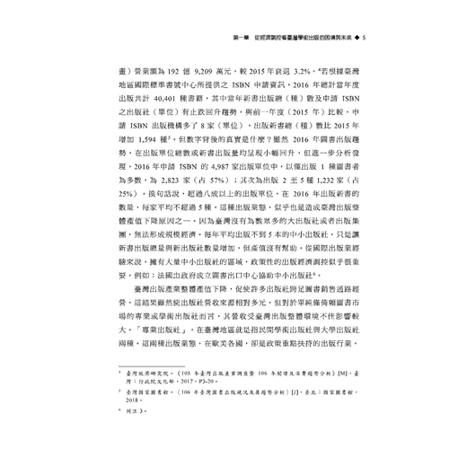 為何要提出版經濟政策呢?因為臺灣的出版產業已經遇到很大瓶頸,若以臺灣近五年的出版產業的資料,更可以窺見一二。2016年臺灣地區的整體出版產業,包含圖書、漫畫及雜誌等,其營業額表現均呈現下滑,代表臺灣整體出版市場,從2012年起至2016年五年以來,呈現持續趨緩態勢。以實體出版市場銷售數據來看,2016年圖書(含漫畫)營業額為192 億 9,209 萬元,較2015年衰退 3.2%。若根據臺灣地區國際標準書號中心所提供之ISBN 申請資訊,2016年總計當年度出版共計40,401種書籍,其中當年新書出版總(種)數及申請ISBN之出版社(單位)有止跌回升趨勢,與前一年度(2015年)比較,申請 ISBN 出版機構多了8家(單位),出版新書總(種)數比2015年增加 1,594 種。但數字背後的真實是什麼?雖然2016年圖書出版趨勢,在出版單位總數或新書出版量均呈現小幅回升,但進一步分析發現,2016年申請 ISBN 的4,987家出版單位中,以僅出版 1 種圖書者為多數,為 2,823 家(占 57%);其次為出版 2 至5種1,232家(占25%)。換句話說,超過八成以上的出版單位,在2016年出版新書的數量,每家平均不超過5種。這種出版業態,似乎也是造成臺灣出版整體產值下降原因之一。因為臺灣沒有為數眾多的大出版社或者出版集團,無法形成規模經濟。每年平均出版不到5本的中小出版社,只是讓新書出版總量與新出版社數量增加,但產值沒有幫助。從國際出版業經驗來說,擁有大量中小出版社的區域,政策性的出版經濟調控似乎很重要,例如:法國由政府成立圖書出口中心協助中小出版社。